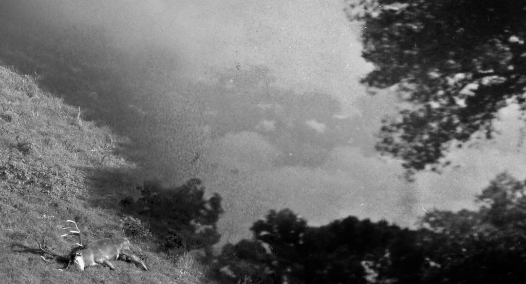 In an elongated pan, mountain landscapes and misty animal imagery are presented in an ethereal, ghostly manner. Locus does not use conventional film footage but instead works with found black-and-white photographs of 1950s and ’60s UFO sightings, combined with online hunting videos. Although the grainy texture of these images reveals their origins, the UFOs have been removed from the photographs, allowing the remaining landscapes to merge seamlessly.The phenomenon of unexplained animal deaths—often reported alongside UFO sightings—serves as a metaphor for human influence on nature. The film offers an introspective look at the Western fascination with, and fear of, extraterrestrial entities, reflecting on the notion of ‘intruders’ in nature. Inspired by dystopian visions of the future, Intruders explores themes of reverse colonization, ecology, and human impact on the environment.
