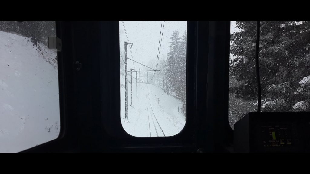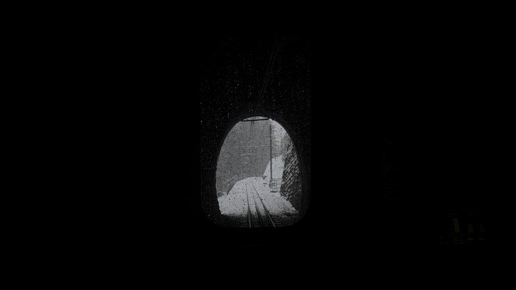 Inside the train from Wengen to Lauterbrunnen, the snow-covered landscape and the darkness of the tunnel, three windows offer serene yet ever-changing impressions.